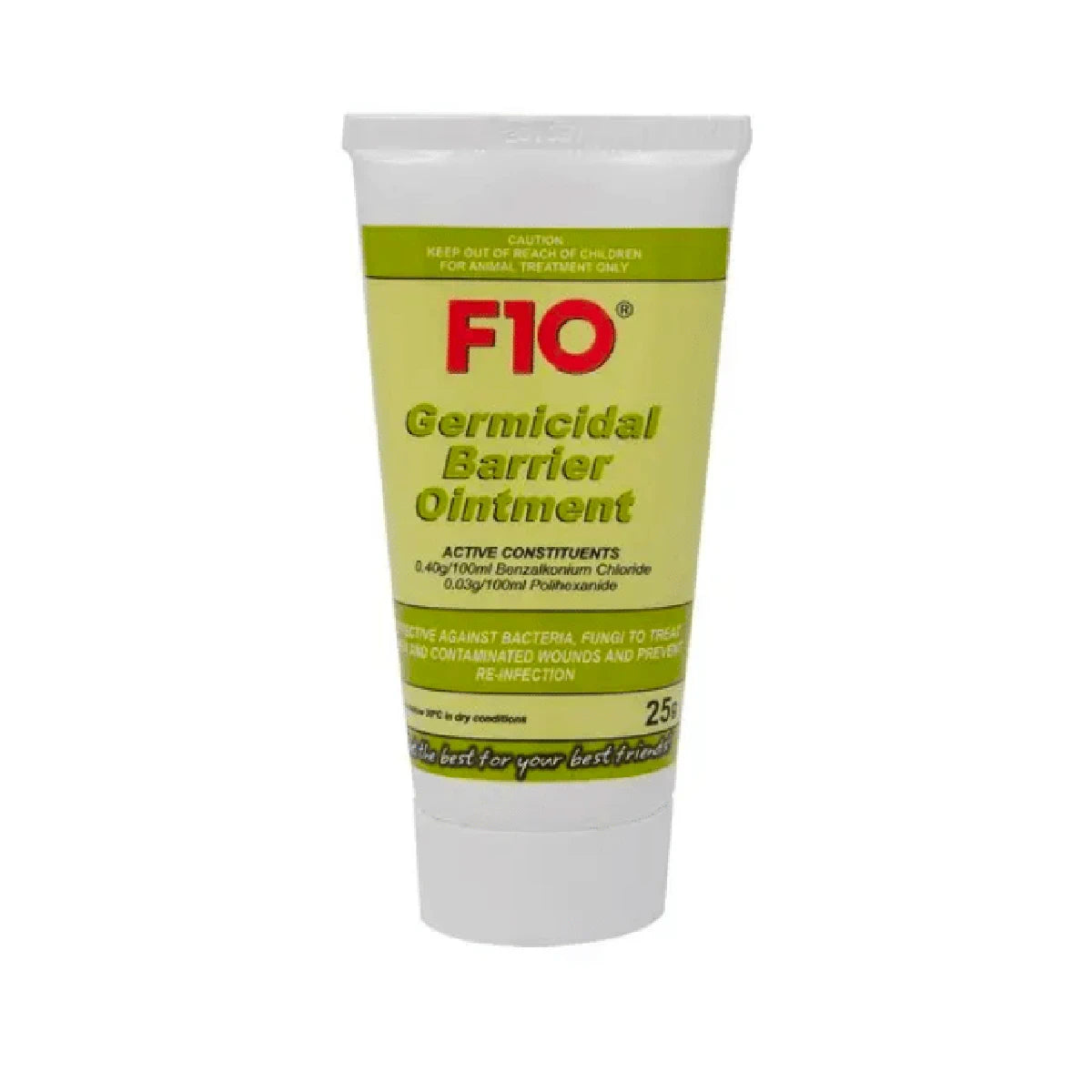 The F10® Germicidal Barrier Ointment is an antiseptic formula highly effective against a wide array of bacteria, fungi, and viruses. It is specifically designed for the treatment of open, contaminated wounds, aiding in the prevention of further infestation. The active ingredients in F10® are combined with lanolin and glycerine emollients in an easy-to-apply ointment. These emollients not only help to maintain and restore skin health but also ensure the ointment remains on the skin to create an effective antimicrobial barrier.