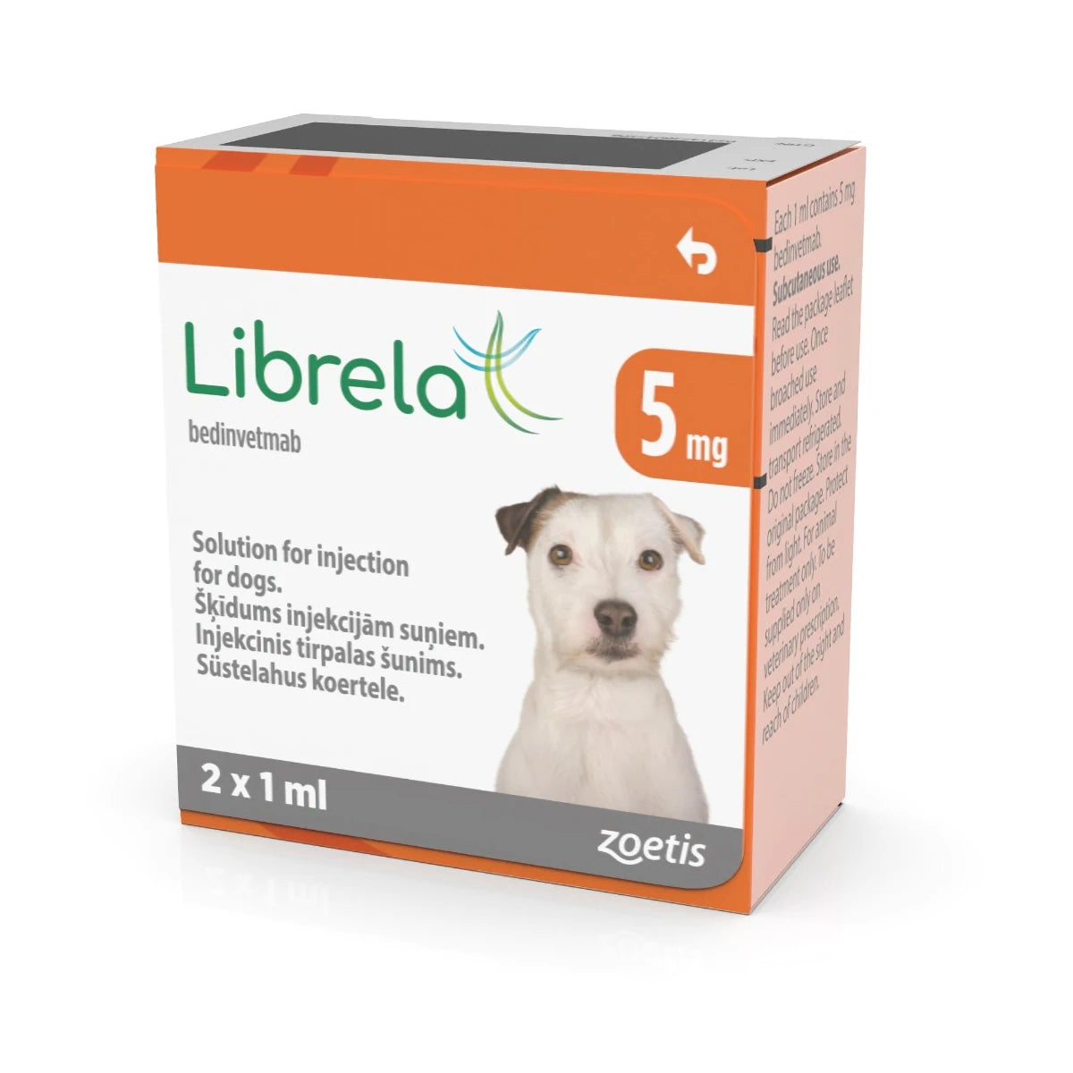 Librela® Solution Injection for Dogs 5mg/ml is a veterinary medicinal product used to alleviate pain and inflammation associated with osteoarthritis in dogs. It contains the active ingredient Bedinvetmab, which is a monoclonal antibody specifically designed to target and neutralize canine nerve growth factor, a key player in the pain pathway in osteoarthritis.
