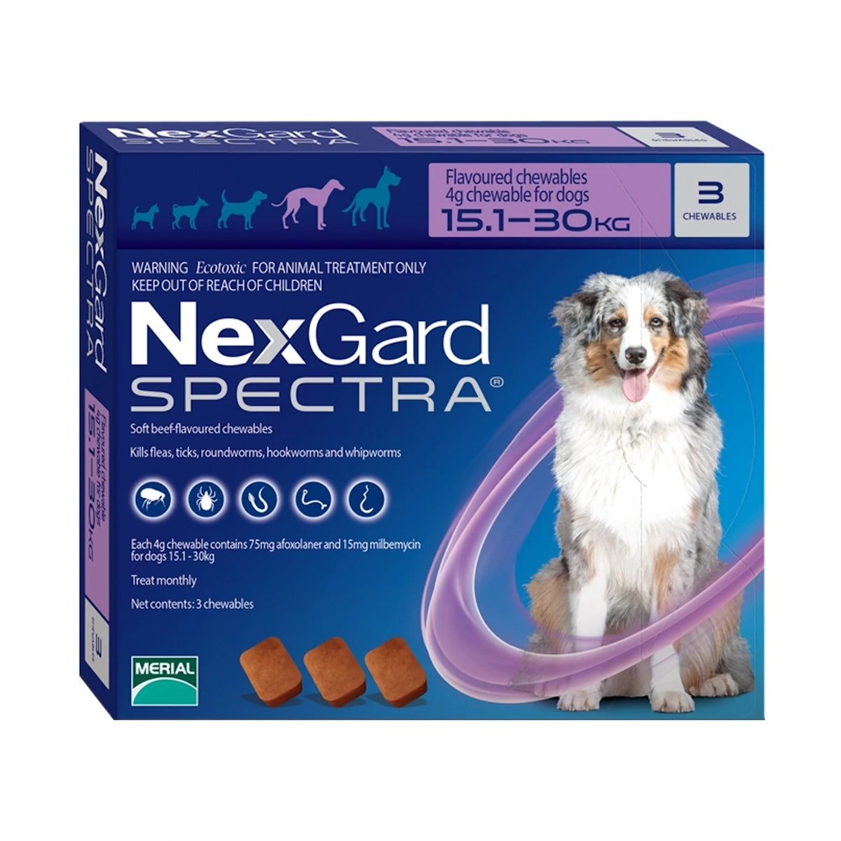 Please watch the video in the product images section, featuring Dr Nick from MyPetsVet for more information about NexGard Spectra Chewable Tablets for Large Dogs, 15.1kg - 30kg.