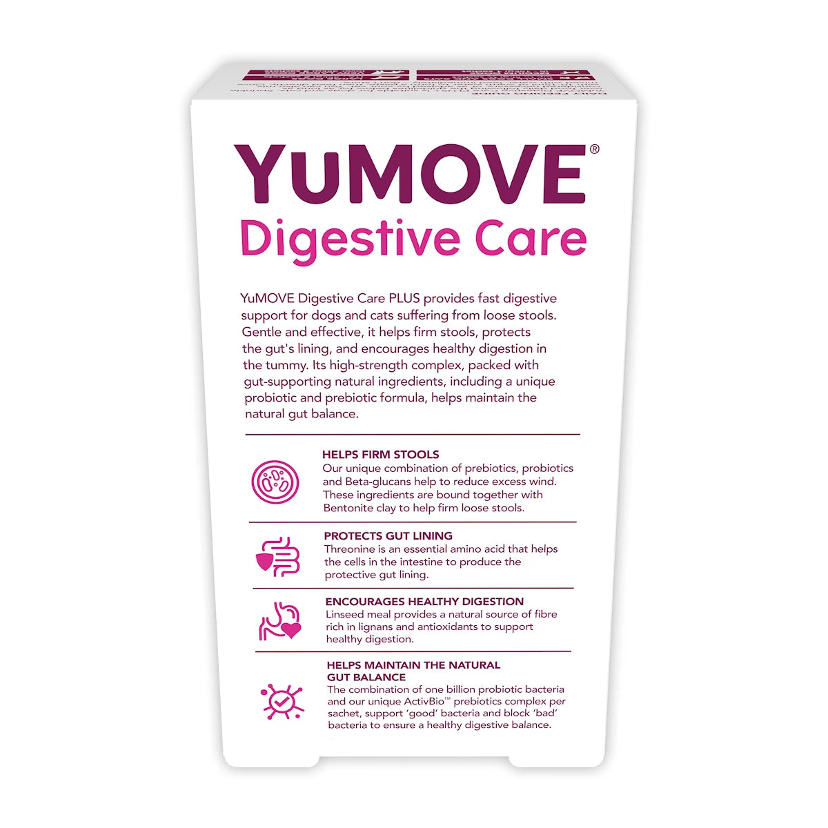 YuMOVE Digestive Care PLUS for Dogs and Cats is a unique probiotic/prebiotic complex that provides targeted support for dogs and cats during an acute digestive episode.